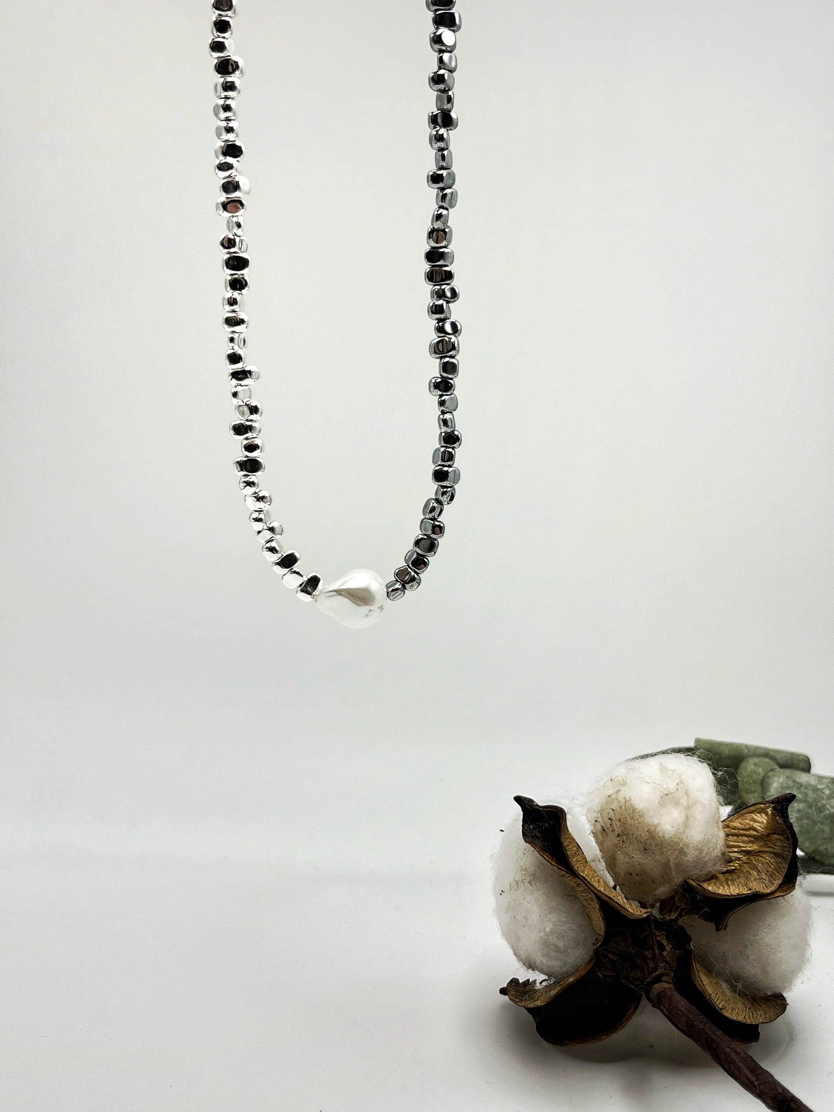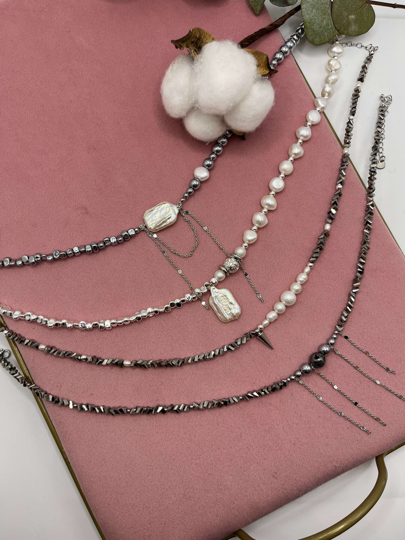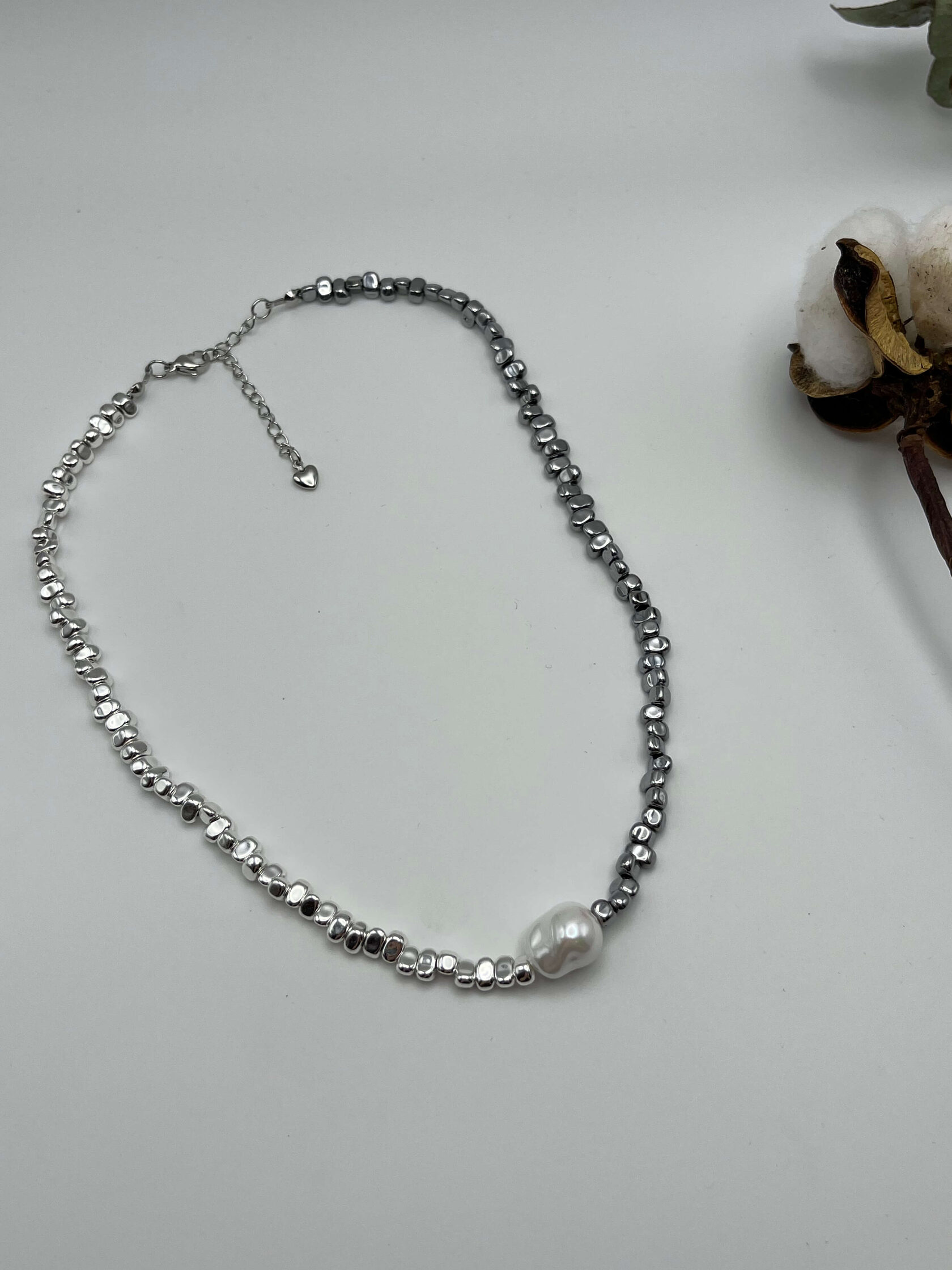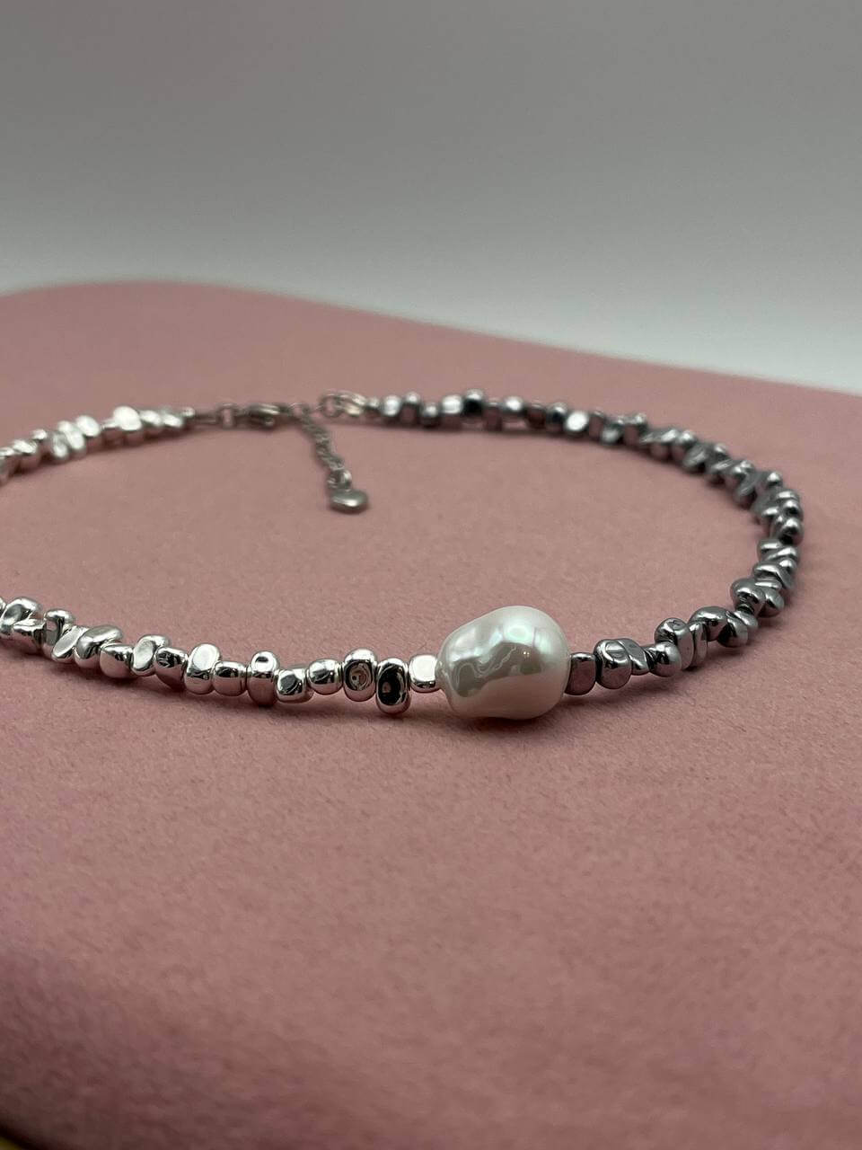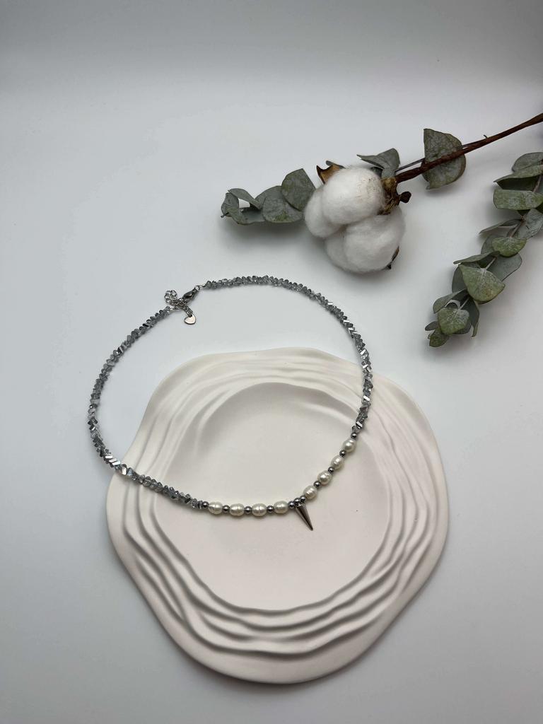 Этот чокер - обет, завязанный на шее. Гематит - твёрдая почва под ногами. Жемчуг - это слои самоценности, которые ты наращивала годами. Каждое зерно - пройденный урок, принятая часть себя, слеза, превращённая в сияние. Он говорит: твоя целостность - результат времени и заботы.