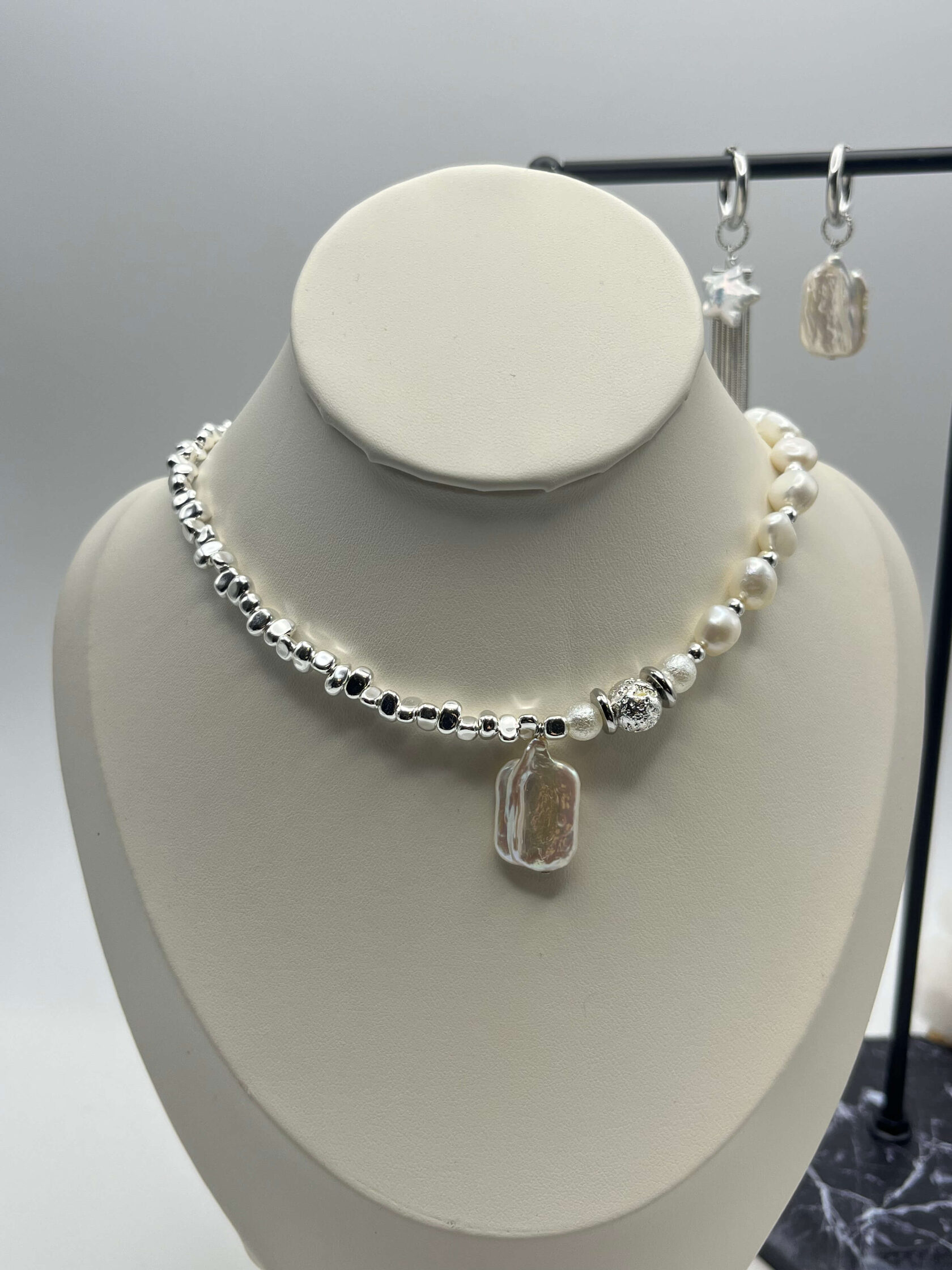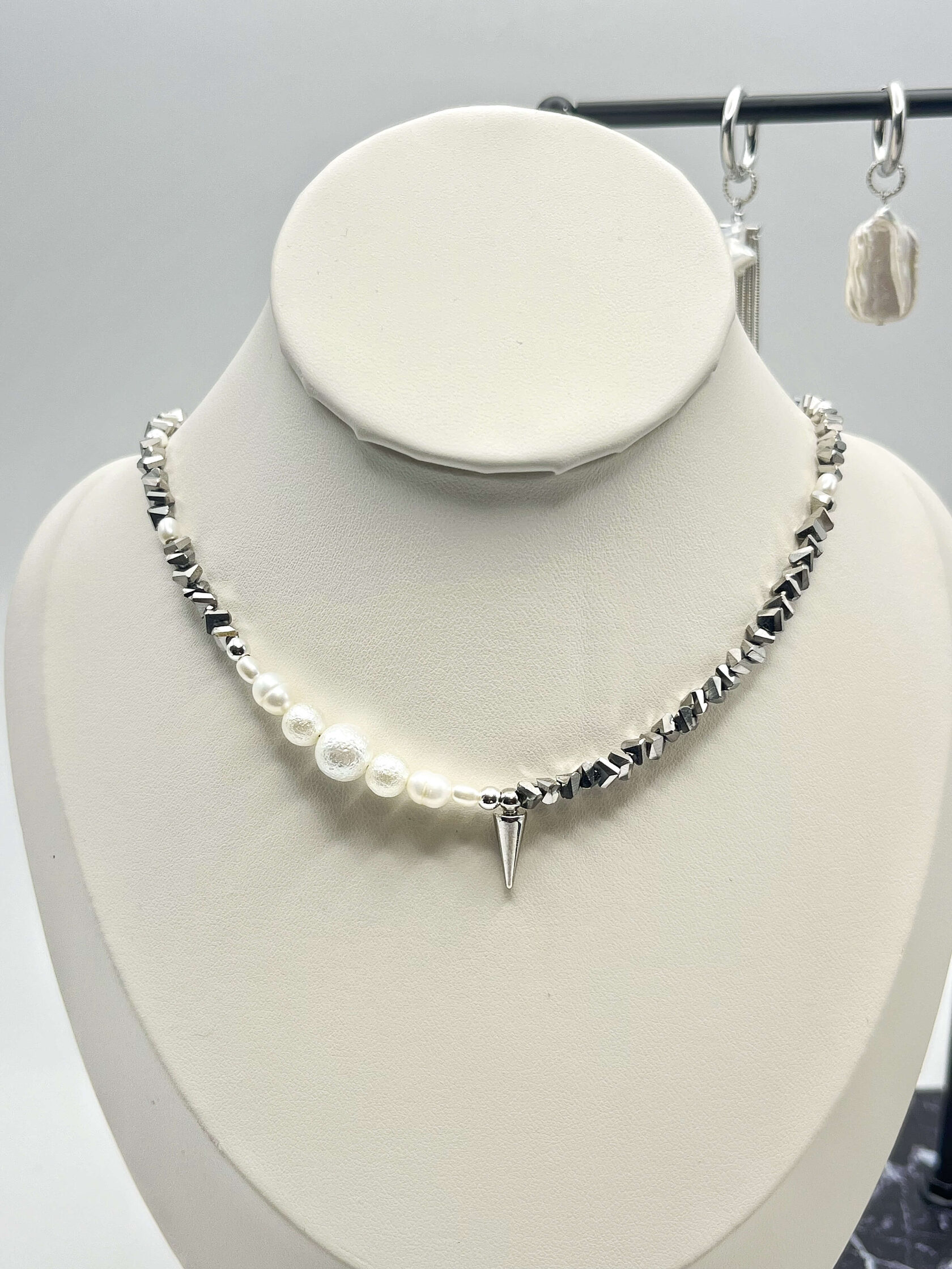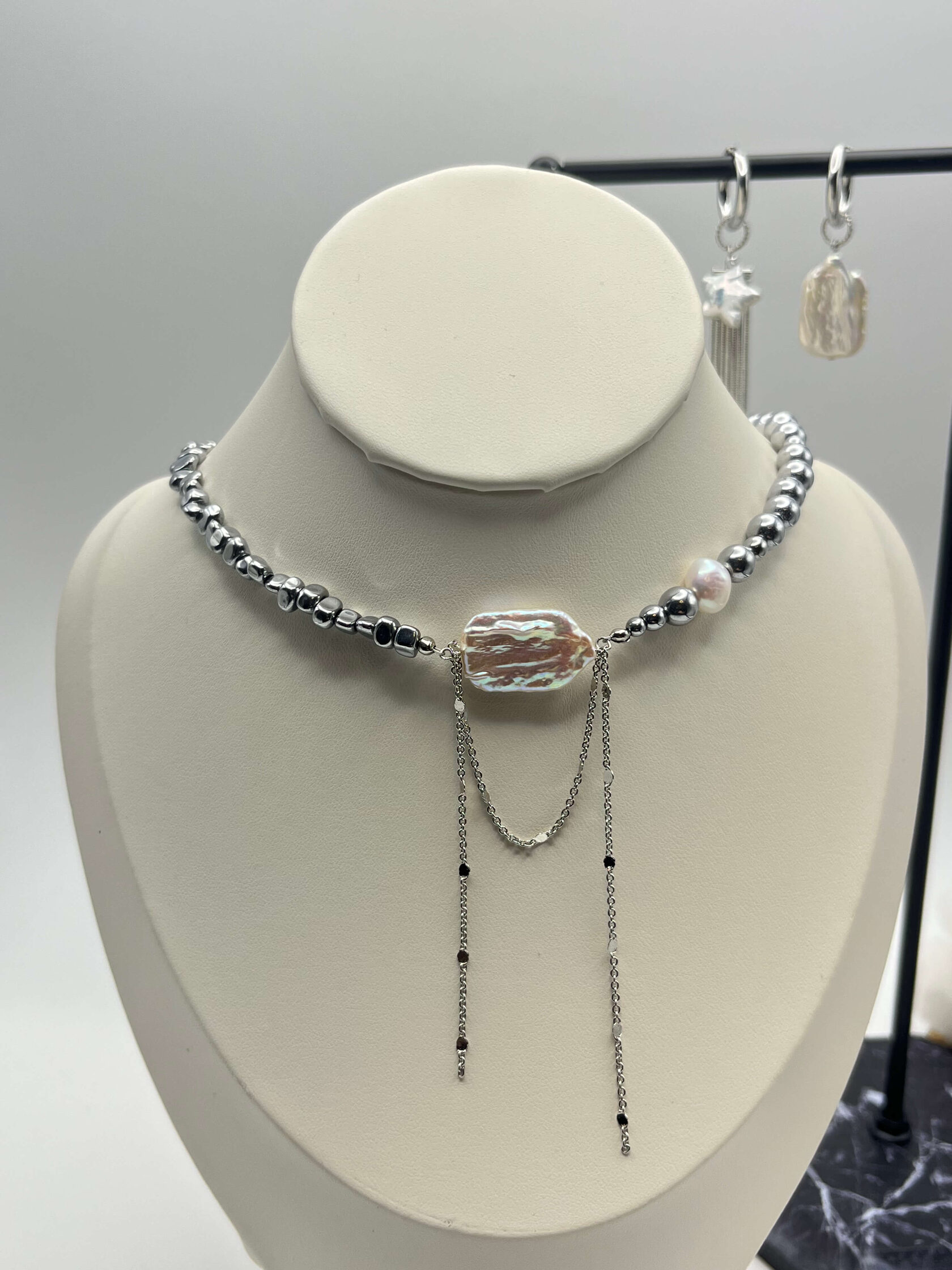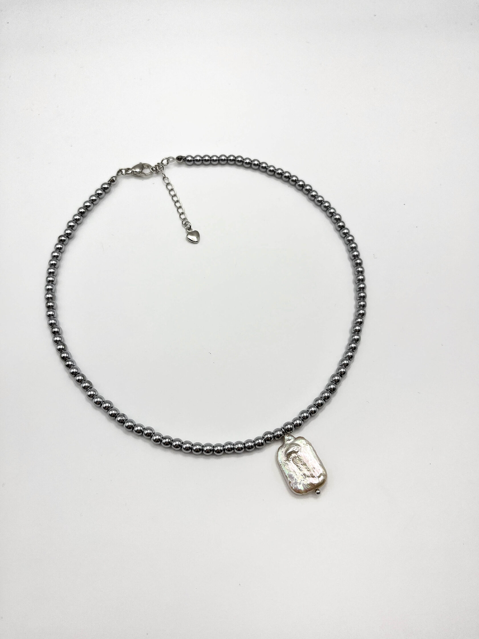 Этот чокер - обет, завязанный на шее. Гематит - твёрдая почва под ногами. Жемчуг - это слои самоценности, которые ты наращивала годами. Каждое зерно - пройденный урок, принятая часть себя, слеза, превращённая в сияние. Он говорит: твоя целостность - результат времени и заботы.